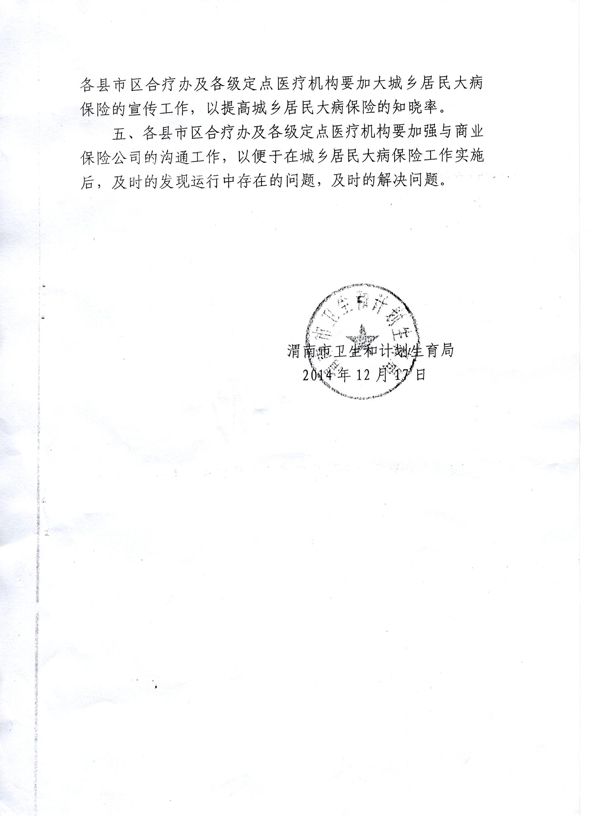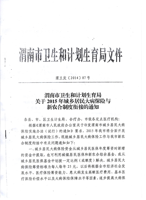 《渭南市卫生和计划生育局关于2015年城乡居民大病保险与新农合制度衔接的通知》