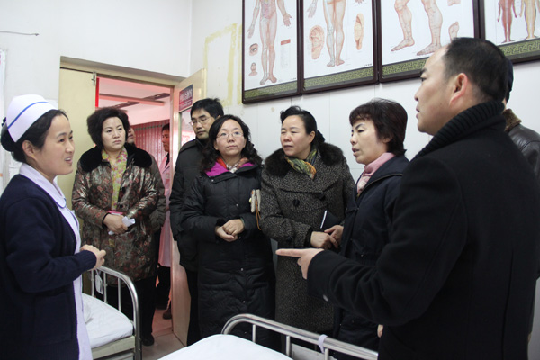 检查组查看医院中医治疗室传统疗法